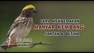 Ciri-ciri manyar jantan Warna manyar jantan lebih pekat Terdapat list berwarna kuning dan sedikit hitam di alisnya (pada musim non kawin) Warna kepala bagian atas manyar jantan berwarna kuning,...
